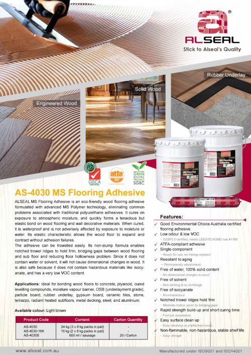Flooring Adhesive MS Polymer AS-4030 is an environmentally friendly timber flooring adhesive. MS polymers are flexible moisture-curing adhesives. It is an advanced technology glue. Adhesives of these technologies solve common problems associated with traditional old-school adhesives.